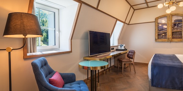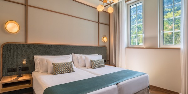 Canfranc Estación, a Royal Hideaway Hotel dispose de 104 chambres conçues avec des espaces chaleureux et élégants qui se fondent avec des éléments art déco subtils pour créer des espaces contemporains et nostalgiques, où des matériaux nobles tels que le bois et le laiton, des tissus riches tels que le velours et une gamme de couleurs inspirée par les années 20 se distinguent. Une autre chose à noter est l’intégration de la culture populaire aragonaise dans certains éléments textiles et dans des jeux de cou