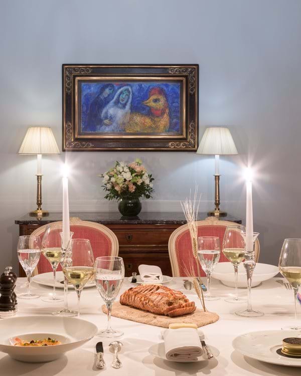 Le Bristol a décoré les murs de sa Suite Paris, d’une œuvre de Marc Chagall et choisit de dresser votre table juste devant. Sous les yeux de ses clients, Les Mariés au Coq, tableau issu de la collection d’Opera Gallery !