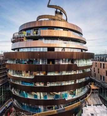 Les architectes du bâtiment, le cabinet londonien Jestico + Whiles , avait d’autres références en tête. Leur application de planification comprenait des images d’un bandeau haute couture de Valentino, ses rubans de soie flottant au-dessus de la tête d’un mannequin. Il y avait aussi des photos de gros rouleaux de papier dans les imprimeries qui peuplaient cette partie de la ville, pour cocher la case « contexte local ». La forme de la collation au chocolat Walnut Whip, née à Édimbourg, a également été mentionnée, ainsi qu’une spirale de zeste d’orange et même un cupcake glacé – de quoi distraire l’esprit scatologique.