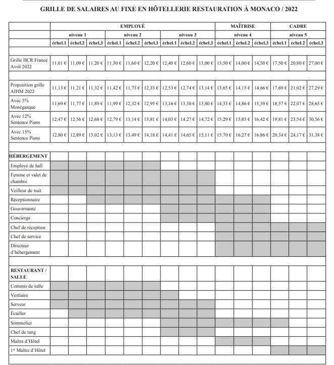 Les partenaires sociaux (Union des Syndicats de Monaco, Association des Industries Hôtelières Monégasques, Fédération des Syndicats de Salariés de Monaco) ont signé le 18 octobre 2022 un accord historique puisque cet avenant à la convention collective hôtelière monégasque présente pour la première fois une grille salariale !