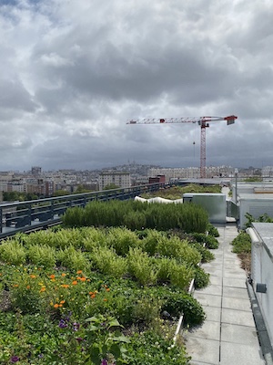 La toiture productrice a ainsi été conçue avec la start-up Topager selon le principe de l’agrivoltaïsme : près de 400 m2 de panneaux photovoltaïques combinés à plus de 300 m2 d’agriculture urbaine, sans intrants chimiques et productive hiver comme été, en fonction des échanges entre le maraîcher et les chefs des restaurants de l’immeuble. Ce potager permet de lutter contre les effets d’îlot de chaleur et d’absorber les eaux pluviales ; en lien avec la faille végétale en façade sud et la façade houblonnée au sud-est, il crée un couloir de biodiversité. L’houblonnière offre une protection thermique passive sur la façade sud – laissant passer la lumière en hiver et offrant de l’ombre en été –, tout en alimentant une micro-brasserie en sous-sol. Cette brasserie peut produire 20 000 litres de bière, consommés sur place, au sein des bars et restaurants de l’immeuble, dans une logique de circuit court, à l’instar des légumes et aromates du potager. En lien avec la brasserie, un composteur recycle les drêches de houblon et les déchets organiques du bâtiment, notamment des restaurants, alimentant en retour les cultures du toit.