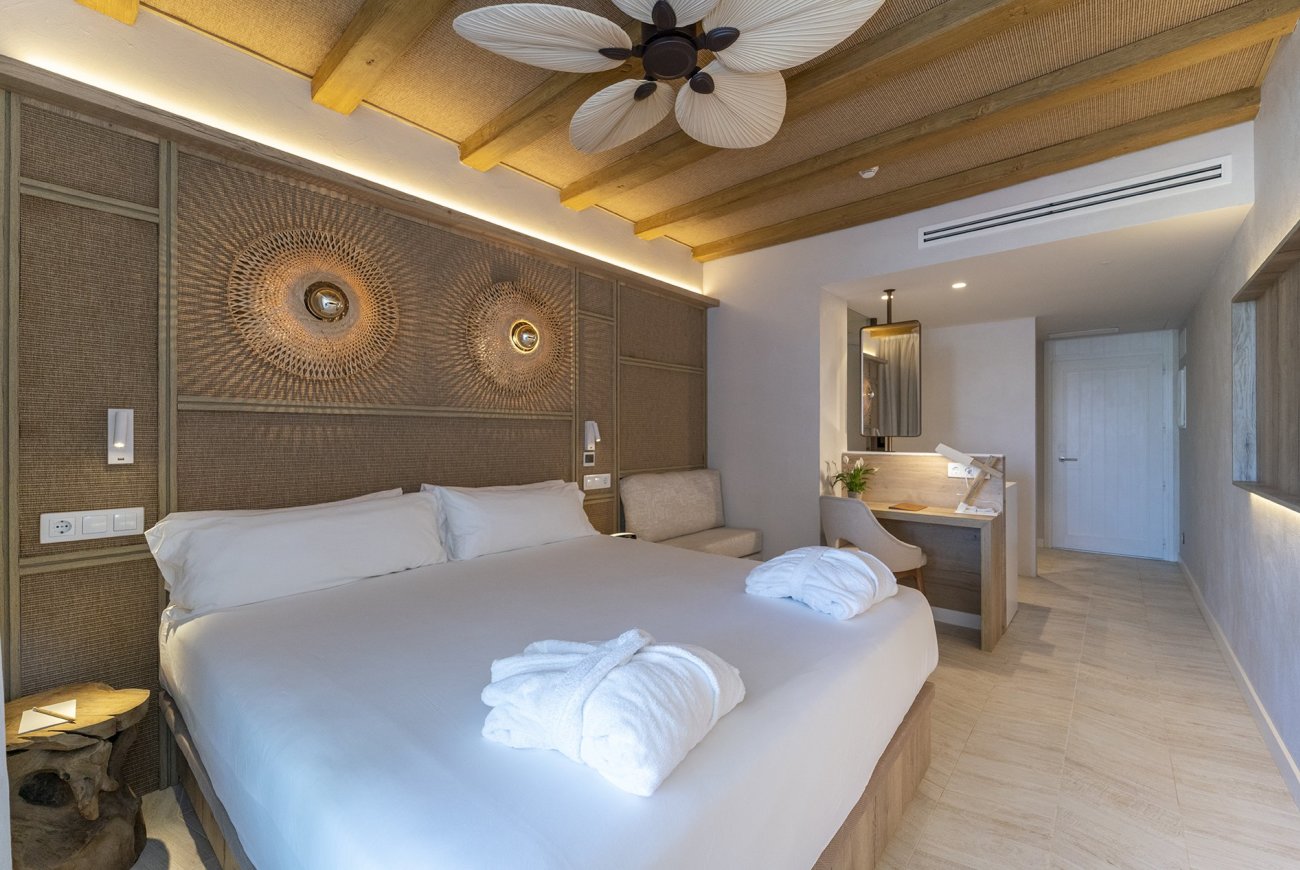 « Notre engagement est de devenir l’hôtel le plus durable d’Espagne et de réduire notre empreinte carbone de 50 % », affirme Lucas García, P-DG de Moga, le groupe hôtelier minorquin à l’origine de ce nouvel hôtel. Les Suites du lac composent cet hôtel cinq étoiles réservé aux adultes – 91 au total – dans la marina de Cala’n Bosch.