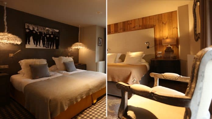 À l’opposé des hôtels qui compensent le manque d’histoire par une vue spectaculaire ou une architecture d’intérieure trop léchée, l’hôtel des 5 Frères – installé au cœur du village depuis 1936, entre l’église et la boulangerie – annonce la couleur dès l’entrée. Accueilli au rez-de-chaussée par une grande photo de famille, le visiteur entre dans une maison «particulière» : il faut monter à l’étage pour rejoindre les pièces de vie. Un salon-bibliothèque, une salle à manger avec de grandes tables en bois patiné pour partager hachis parmentier, blanquette de veau et autres petits plats maison. Pour le mobilier comme pour les étoffes, les sœurs ont privilégié le travail des artisans locaux et en particulier, celui de la filature bicentenaire et familiale Arpin.
