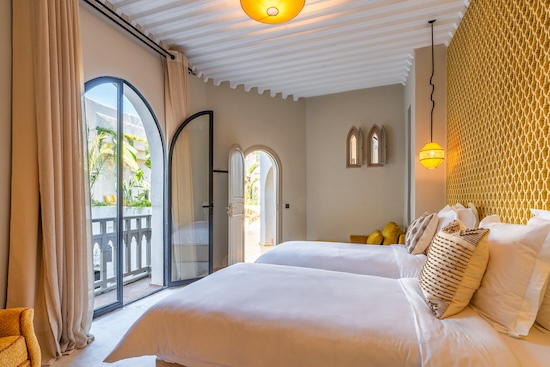 Chacune des chambres se distingue par sa luminosité, caractérisée par des plafonds élevés et des éléments architecturaux traditionnels tels que des portes et fenêtres en arche, reflétant le style caractéristique du Maroc.