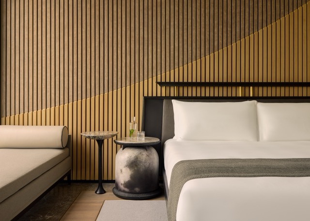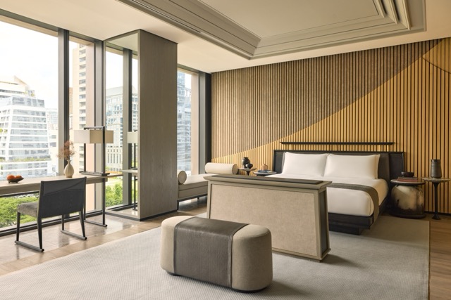 Des baies vitrées encadrent la vue sur le parc et la ville. Chaque suite est soigneusement conçue dans une palette de couleurs douces pour une atmosphère apaisante. Le vaste espace de vie, le mobilier aux proportions généreuses et la technologie de pointe reflètent l’élégance discrète d’Aman. Les panneaux lumineux pivotants, signature de la marque, permettent de personnaliser l’espace, créant en quelques secondes un espace semi-ouvert entre la salle de bain et la chambre.