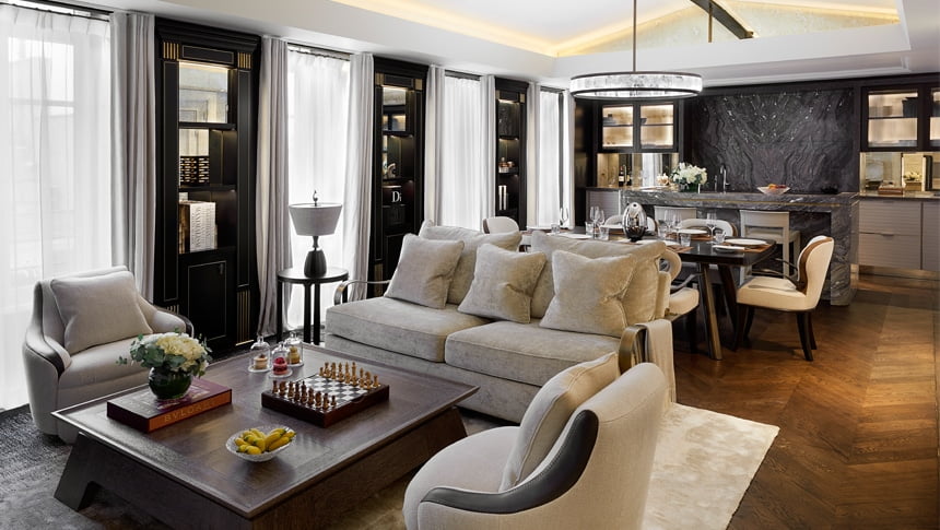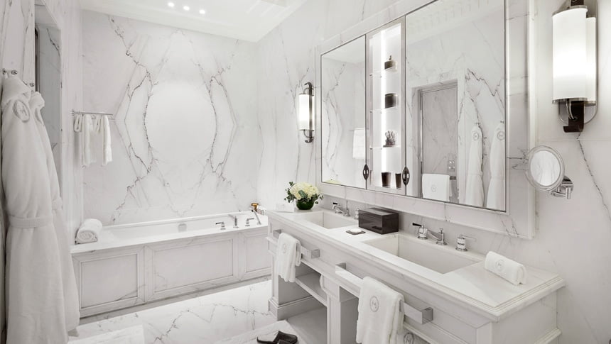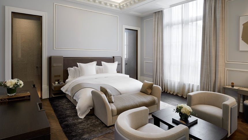 Il faut intégrer l’architecture d’origine, donner au lieu une touche de modernité tout en préservant son lustre d’antan, deviner où étaient les dorures, quelles formes avaient les moulures, etc. Nous avons dû renforcer le sol de certaines de nos suites pour installer de sublimes cheminées en marbre pesant jusqu’à 1300 kilos, d’un seul et même bloc de marbre, entièrement poli. Nous avons également tenu à optimiser autant que possible la dynamique environnementale du groupe, notamment en utilisant le réseau d’eau non potable de Paris, ou faire que nos installations utilisent le différentiel de température afin de chauffer l’hôtel en hiver et le refroidir l’été.