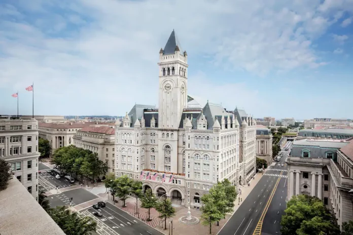 Situé à quelques centaines de mètres à peine de la Maison Blanche, et à peine plus loin du Capitole, l’édifice dans lequel est logé l’hôtel n’appartient pas à la Trump Organization.